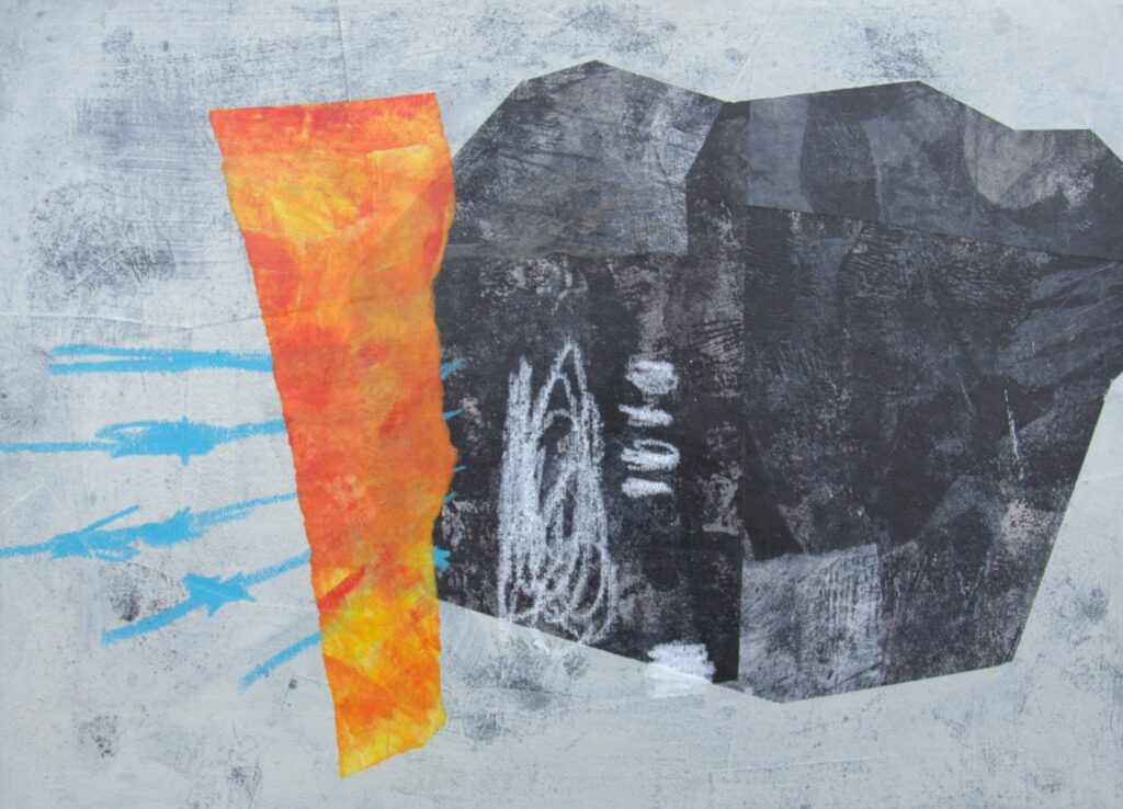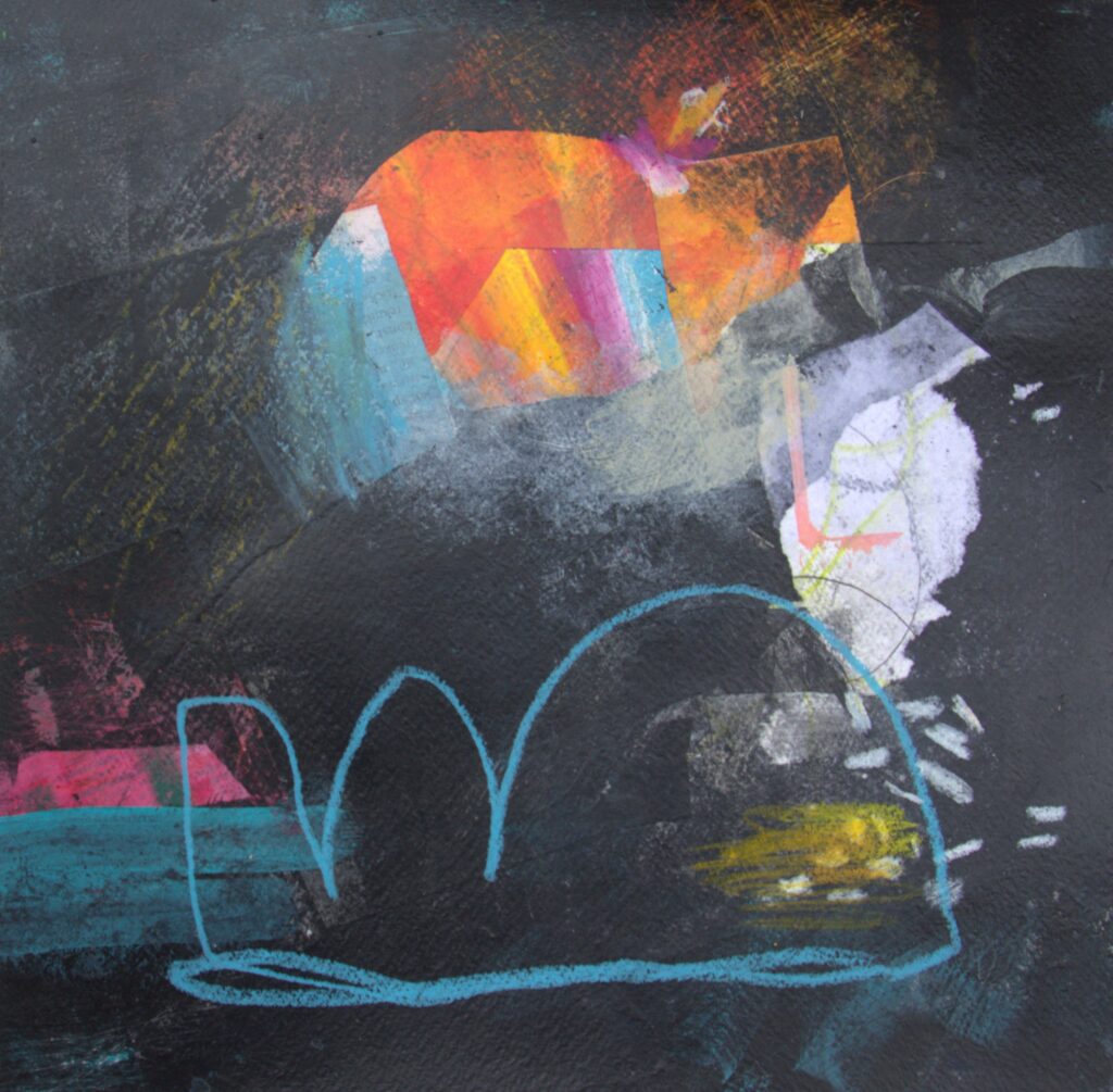 Collage and wax crayon on panel